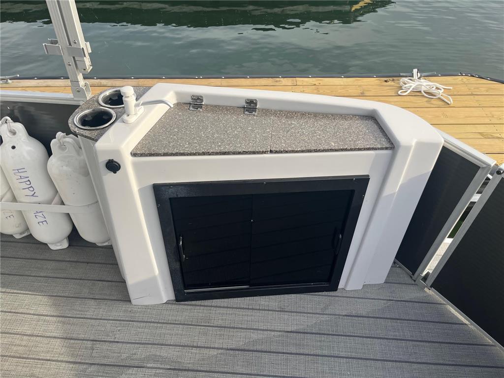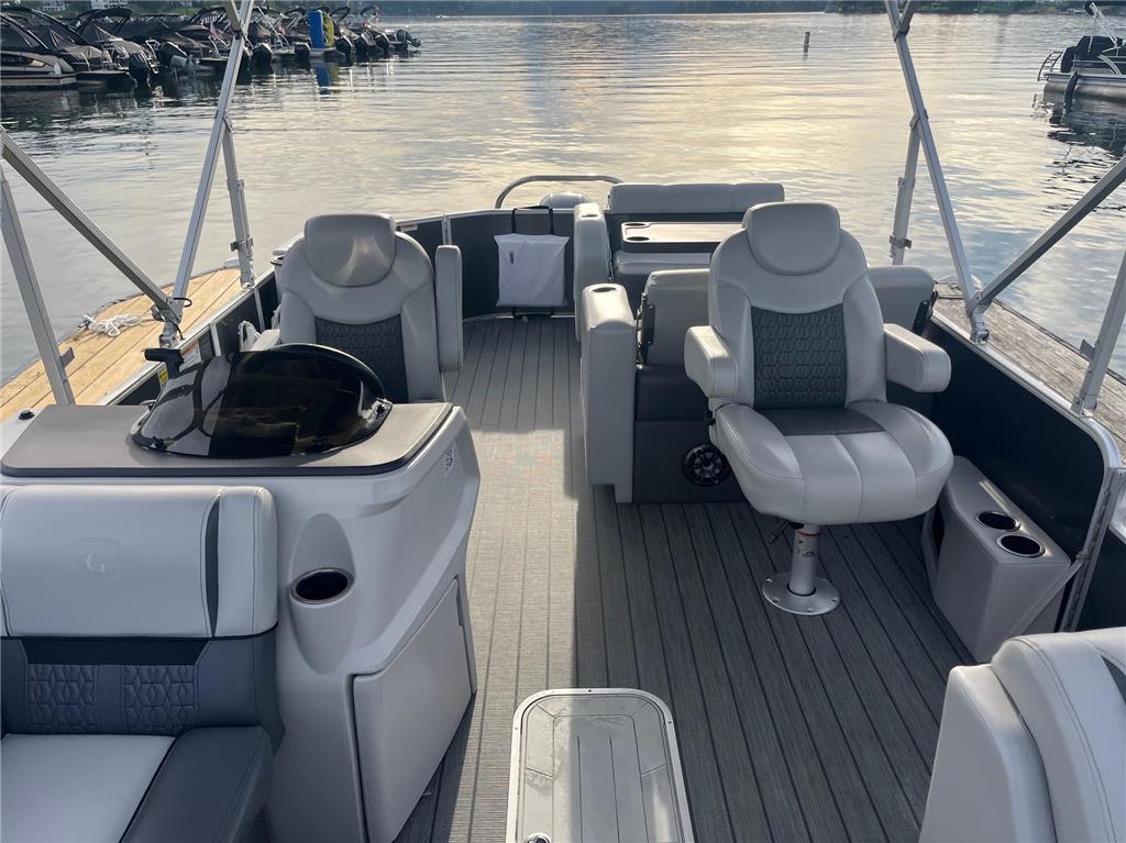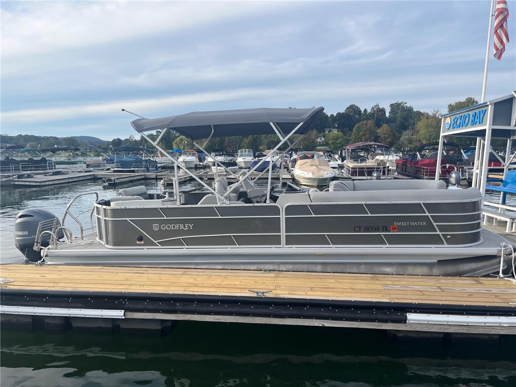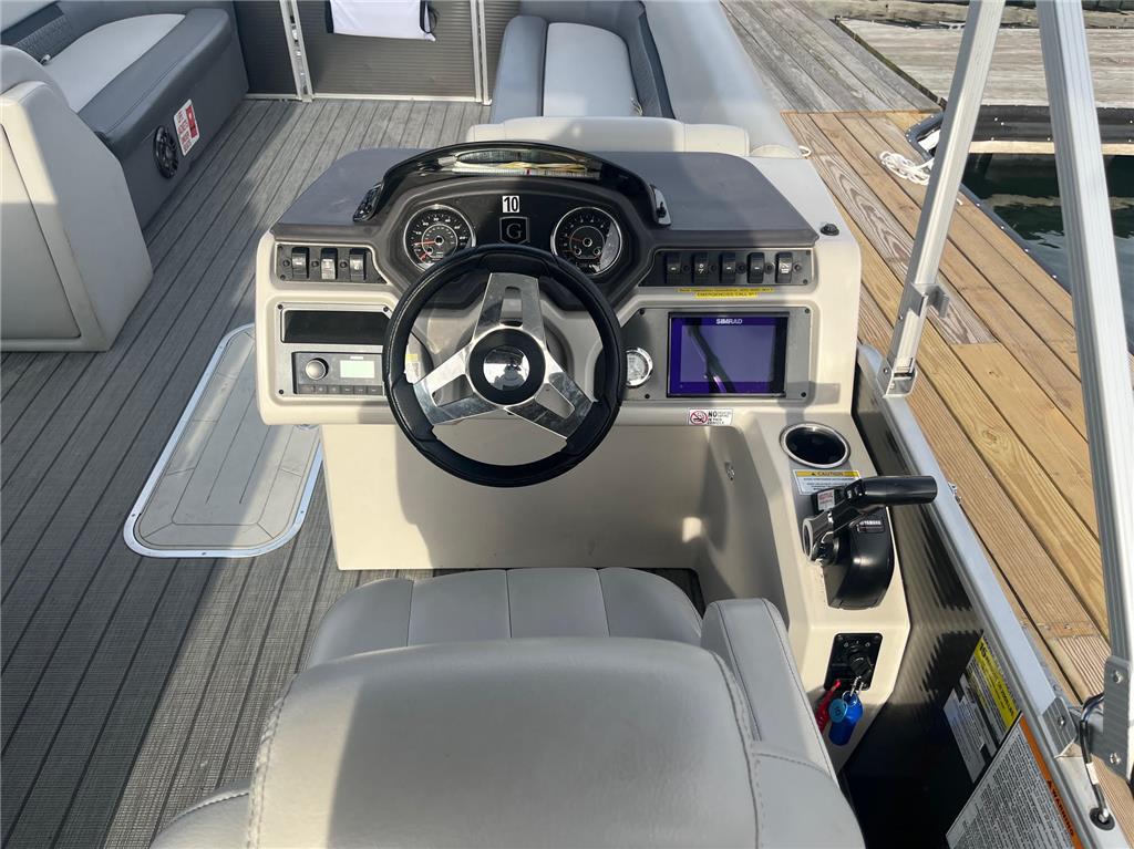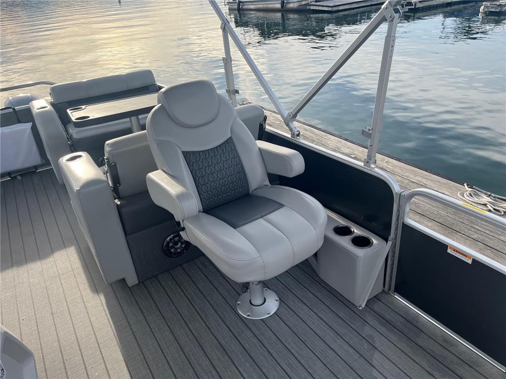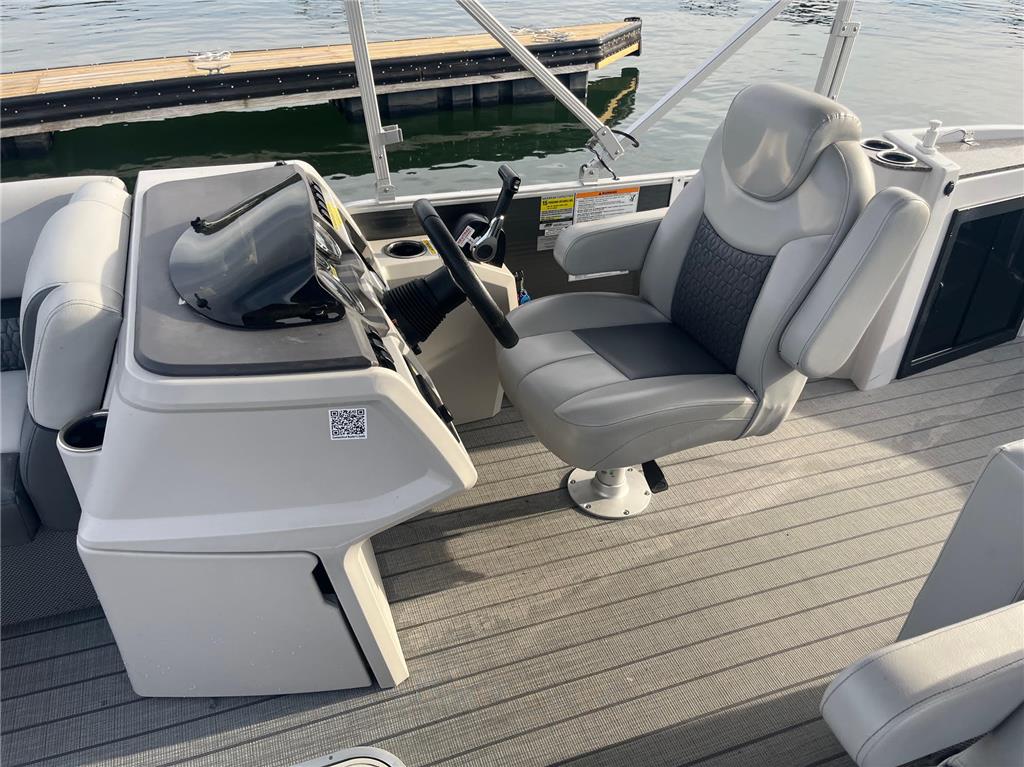 2023 Sweetwater 2486DT with only 300 hours on the Yamaha F150 outboard! This Sweetwater is loaded with options and includes the GTP 27" triple tube package, ski locker, ski tow bar, upgraded steering wheel, LED docking lights, windscreen, phone charger, Fusion color cast stereo upgrade, SeaStar hydraulic steering, Simrad GO7 chartplotter, co-captain's chair with storage box and cupholders, upgraded lunar luxe gray upholstery with quilting, wicker seat bases, upgraded harbor gray seagrass flooring, stainless steel pull-up cleats, and more! Rental equipment will be removed prior to sale.