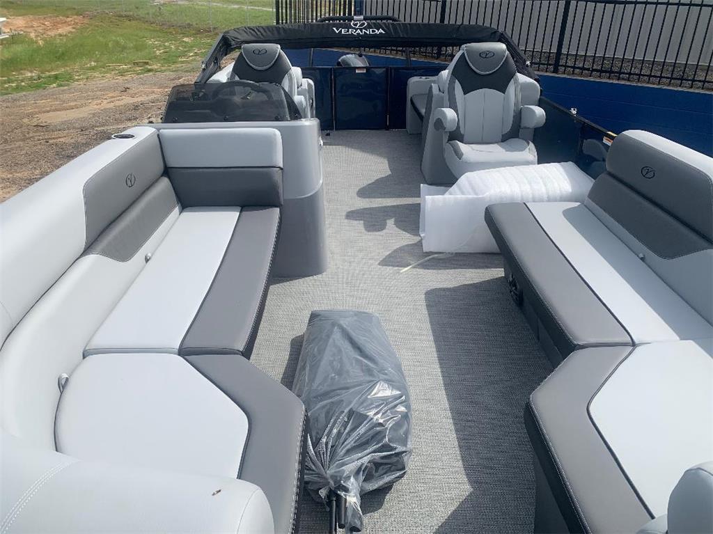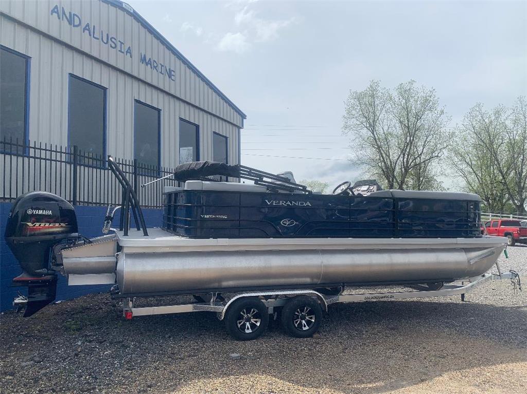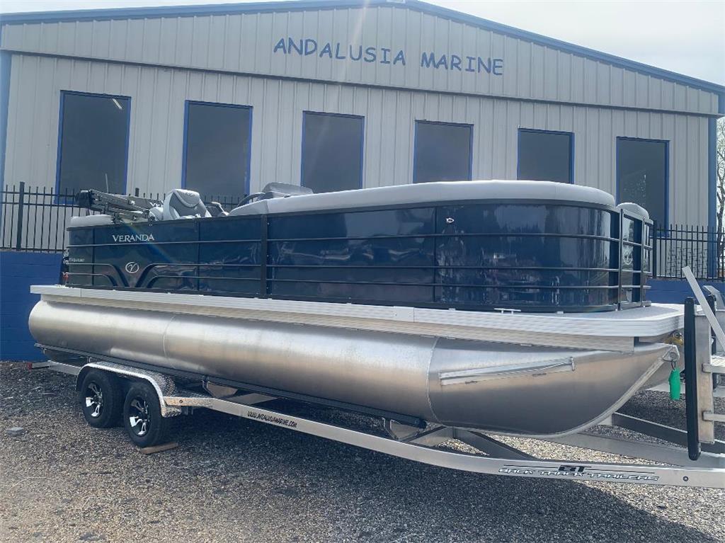 New 2024 Veranda Vista View 22RC pontoon in stock at Andalusia Marine!! Like all Verandas; the Vista View series has an all aluminum interlocking floor for the ultimate in longevity, quality, and rigidity. The Vista View from Veranda offers a more economical alternative to Veranda's long popular Relax series without sacrificing all the great features Veranda has become known for. This boat features three 25" pontoons, Indigo Blue Metallic Panels, Black powder coated rails, Black Bimini top, hydraulic steering, dual captain's chairs, Lowrance Hook4x graph, Stainless Steel prop, Woven grey flooring, and Veranda's Vista View Amenities Package (Stainless swim ladder and Ski Tow Bar), and full boat cover Price includes an aluminum Backtrack tandem axle trailer. (Deduct $4,000 for no trailer)