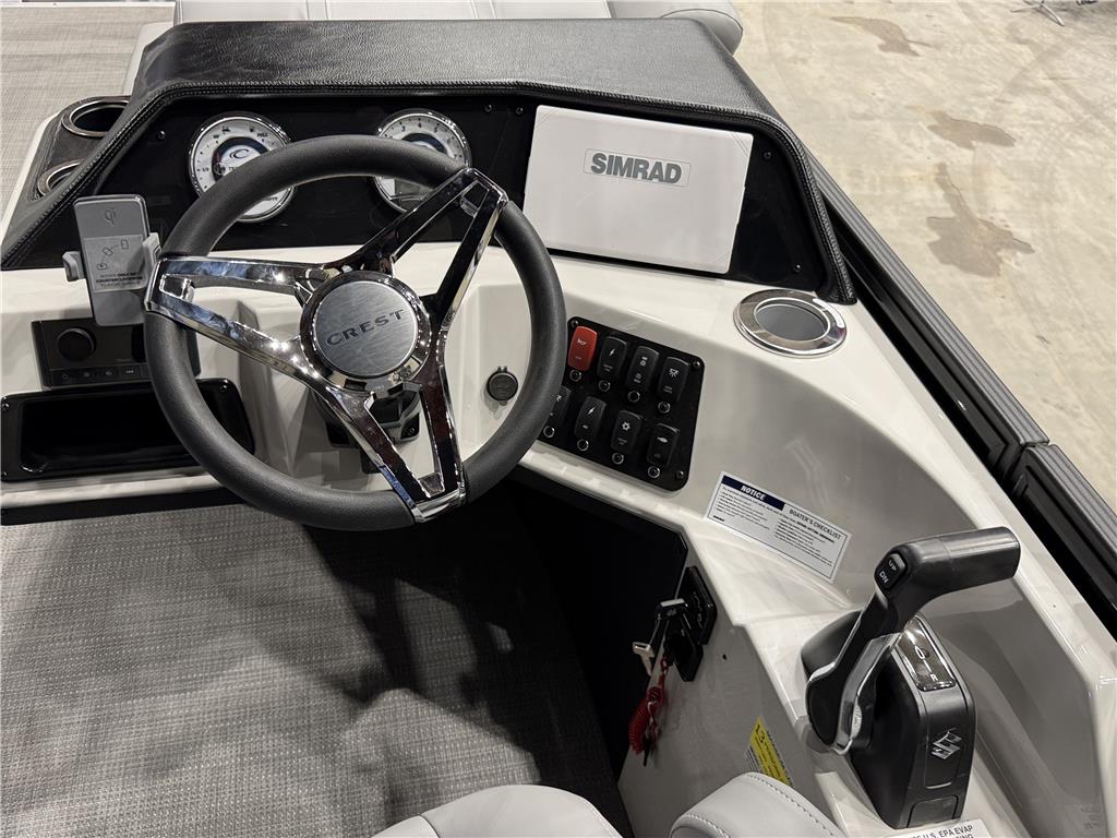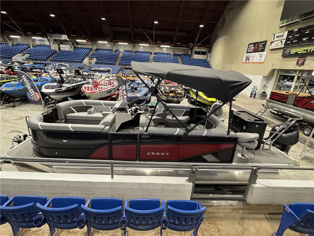 2025 Crest Classic 220 Fish powered by a 140HP Suzuki 4-stroke outboard. This 22-foot pontoon features aft fishing stations with swivel chairs, rod storage, livewell, and wraparound lounge seating with soft-touch marine vinyl. Equipped with a fiberglass helm, Bluetooth stereo, manual Bimini top, and ample storage. Built with Crest’s Marine Armor coating for durability and a smooth, stable ride—ideal for both fishing and family cruising.