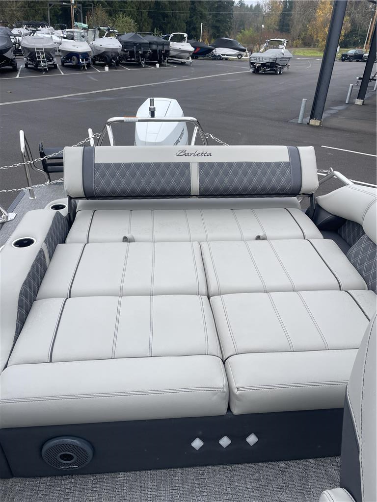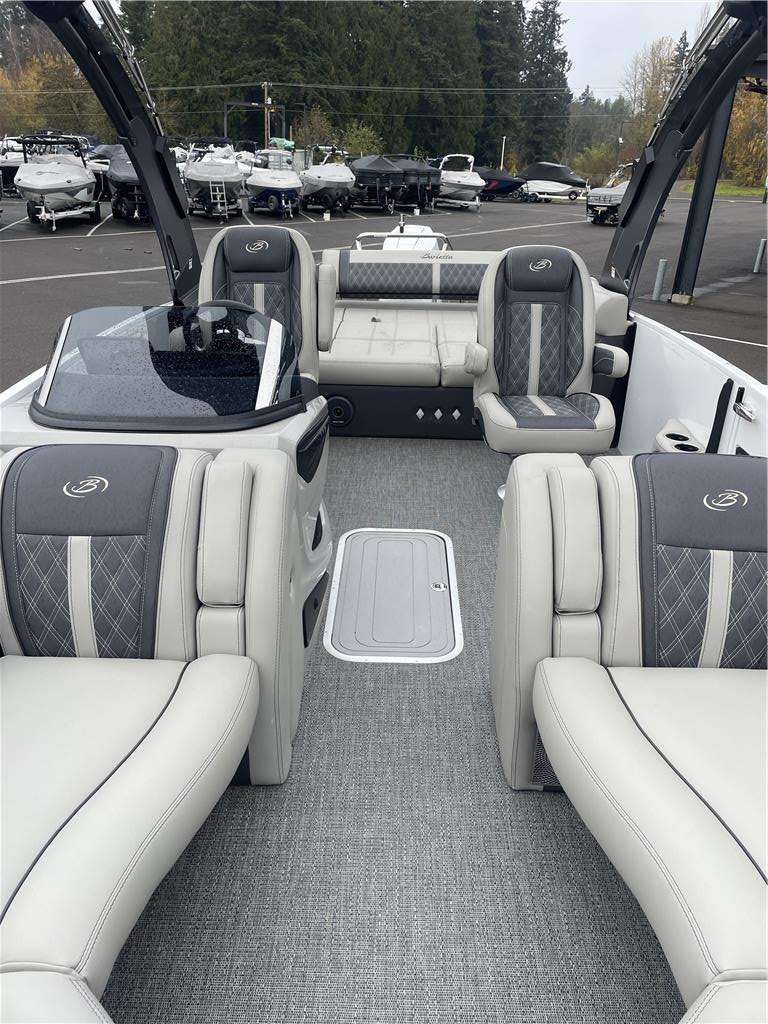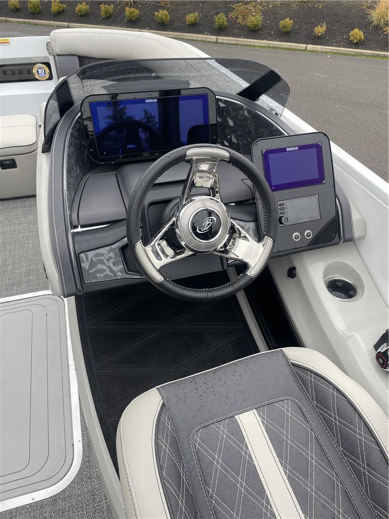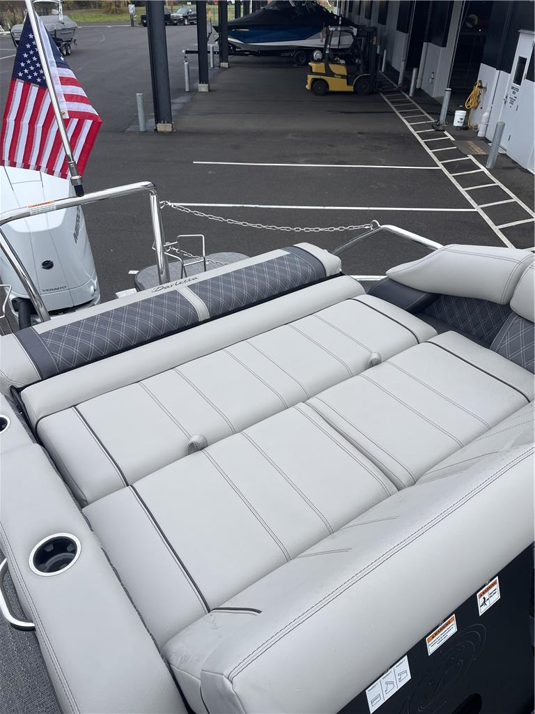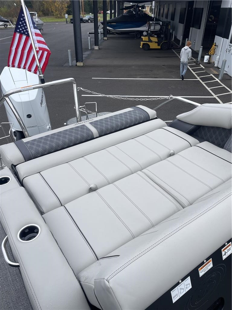 Mercury 400 L V10 Verado Trailering Cover Ottoman W/ Built in cooler storage Helm windshield STANDARDS :: RAILSKIN PACKAGES Blackout Package PACKAGES Triple Toon Package w/ Midship and Bow Anchor Storage - Leggera STEERING Hydraulic Steering, Power Assist Steering (req. Hydraulic Steering) CANVAS Snapless Playpen Cover, Power Arch w/ Power Bimini CONSTRUCTION 10 Year Bow-To-Stern Warranty, 20" Transom, 26" Diameter Pontoon Tubes, 3/4" Marine Decking, Dual Battery Trays with Remote Switch, E-Z Fill Fuel Station with "Yeti-Ready" Cupholders, Extended Activity/Swim Deck, Full Fiberglass Rail System, Full Length Dual Stage Lifting Strakes with Invasive Species Flush, Full Length Exterior Wave Tamers (Outside Tubes), Full Length Solid Keel, Full Length Underbelly Skin, Hybrid Crossmember Configuration - Combination Box/I-Beam and C-Channel, Internally Reinforced .125 Nose Cone, Limited Lifetime Structural Warranty, NEW 8" Stainless Steel Pop-Up Cleats, Reinforcement In Stern Tubes for Additional Support, Sealed Automotive-Style Deutsch Electrical Connectors, Tube Skirting, V.I.P. Technology (Vibration Isolation Pad) EXTERIOR (4) Phender Pro Quick Release Fender Mounts, Bow & Port Gate with Doggie-Dock View See-Through Acrylic, Enhanced Metal Jacket Protectant, Four (4) Stainless Steel Quick Release Fender Clips, LED Docking Lights, Stainless Steel Accessory Mounts (Installed Opposite Side of Ladder), Stainless Steel Flag Pole w/American Flag, Stainless Steel Rub Rail Insert, Stainless Steel Safety Stanchions w/ Chains, Stair Step Pet Friendly Stern Boarding Ladder w/Stainless Steel Handles INTERIOR E-Z Access Integrated Waste Basket with Dedicated Storage, Integrated Arm Rests in Bow Furniture, Stow-Away Table and Storage in Port Chaise, Ultra-Lounge - Multi-Position Stern Lounge with USB Ports & Yeti-Ready Cupholders, Underseat Mood Lighting, Underseat Storage Vents LIGHTING Exterior Lighting - White Underdeck and Underwater, Interior RGB Lighting Package Leggera *NEW- Addressable RGB Lighting* ENTERTAINMENT Anchor Storage at Bow Gate, Harmen Kardon Marine Stereo with 8 Speakers, 1 Subwoofer, 2 Amplifiers, Stainless Steel Fender Baskets (2), Stereo Remote at Stern Swim Deck, Tube-Tow Watersports Cage, USB Charging Ports (2 at each Chaise Lounge, 1 at Helm, 2 at Co-Captains Chair), Yeti-Ready Stainless Steel Cupholders Throughout HELM Dimmer Switch, Extra-Large Integrated Glove Box, Extra-Large, Highback, Reclining, Helm Seat with Swivel and Slide, Fire Extinguisher, Integrated Cell Phone Storage with Wireless Charging Station and AUX, Integrated Lockable Glove Box, Integrated Pet Food/Water Dishes, Integrated Underhelm Storage Pocket, Premium Steering Wheel,