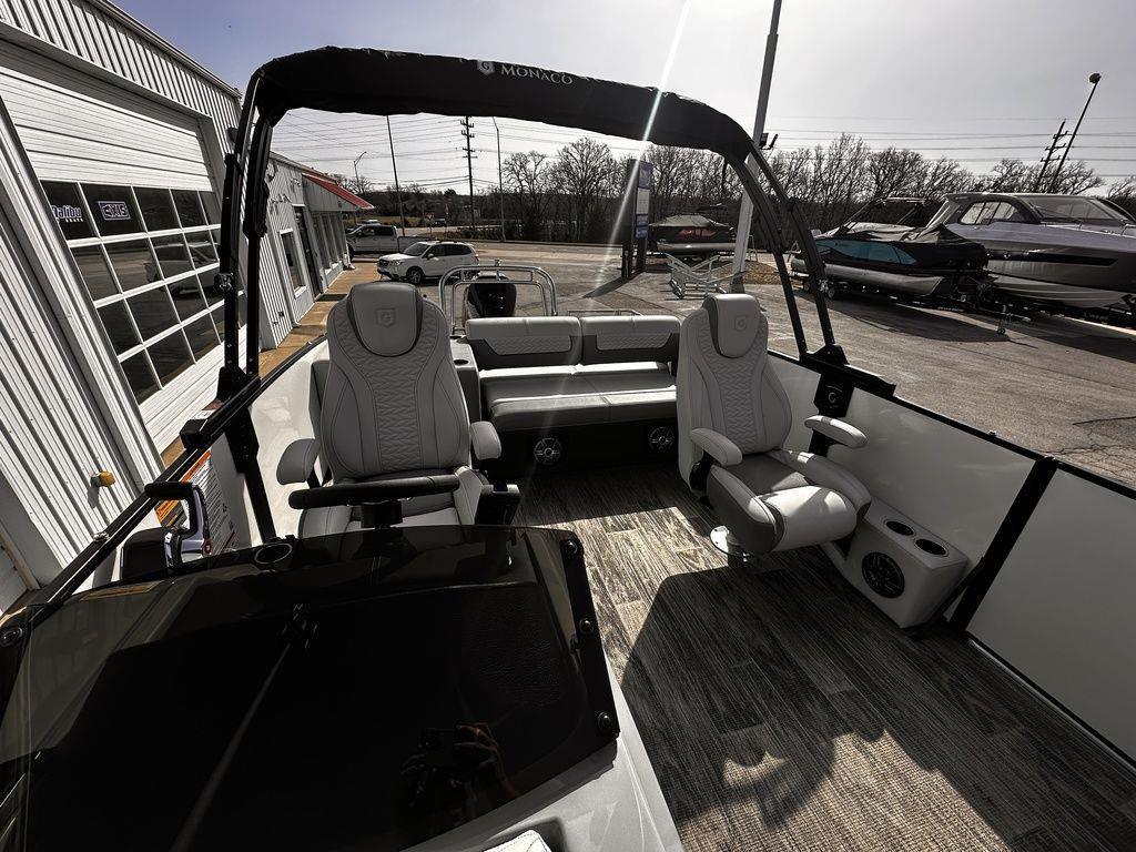 2025 Godfrey Pontoons Monaco 255 DFL iMPACT + Package (29 in. Center Tube)Monaco LoungeSometimes the best days on the water with family and friends are when you do nothing at all. Relax and stretch out with a Monaco Lounge model in 23 and 25-foot lengths.All Day Lounging IncludedLet the rhythm of the water and the company of friends allow you to relax, recharge, and relish in the moment. Take it all in from one of our upscale loungers and never miss a beat when you're out on the water.Ladder Up To MoreLive up the good times and enjoy cannonball after cannonball with your favorite people. Upgrade to our Stainless Steel Comfort Climb Ladder for added comfort on the water.Better TogetherEnjoy the best moments on water side-by-side with one of our Single Flip Lounge, Dual Flip Lounge, or Rear Lounge models where you can create the perfect place to catch some rays or simply catch-up with others.Pup ApprovedGet ready for a pawsome day on the water! With our optional integrated dog bowl insert, your pontoon pup can join in on the fun and stay hydrated too!The New Shape Of ControlOur intuitive, next-generation helm allows for optimal upgrades as well as obstruction-free under helm access.Dual Flip Lounge allowing passengers to face foward or backEnjoy more space with the standard extended deckConvertible lounging from bow to stern